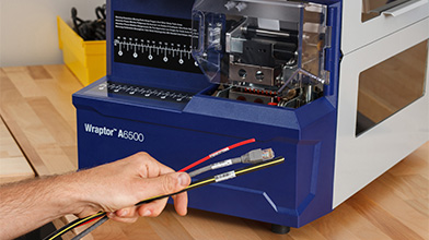Nasz system Wraptor A6500 można skonfigurować z systemami przycinania i usuwania izolacji z kabli i przewodów marek Komax i Schleuniger. Wystarczy wprowadzić do systemu odpowiednie dane na temat cięcia, usuwania izolacji i etykietowania, aby w zaledwie kilka sekund wszystkie te procesy zostały skutecznie wykonane, zwiększając w ten sposób wydajność produkcji.
